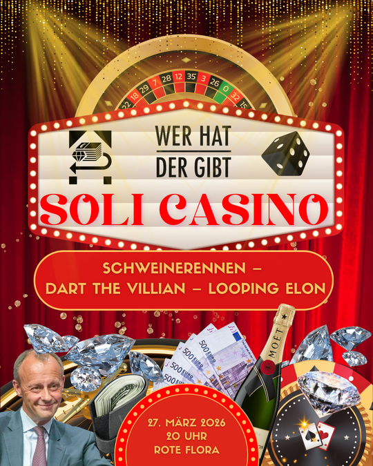 Der Kapitalismus spielt jeden Tag mit unserer Zukunft – heute drehen wir den Spieß um! Wir laden euch herzlich ein zum ultimativen Soli-Casino. Wir zocken nicht auf die Esso Häuser, sondern für den guten Zweck. Kapitalismus ist ein Glücksspiel, wir setzen auf Spiel 😉