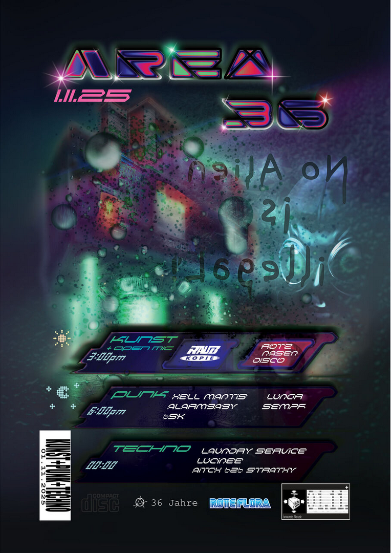 36 years not sold, not controlled, and not categorized. With AREA 36, we temporarily open what is structurally missing. Between art, live music, and bass, we create visibility for all that is otherwise overlooked. We celebrate diversity as a practice, not as a label. We stand for 36 years of solidarity instead of exploitation, commons instead of property, rootedness instead of displacement, equality instead of oppression, and dedication instead of coercion.