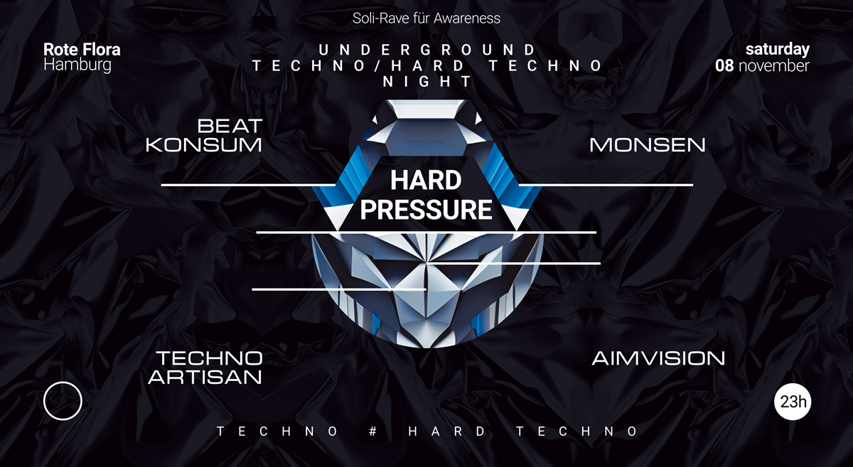 Die Rote Flora verwandelt sich am 08. November in ein dunkles, pulsierendes Kraftwerk – wo treibende Basswellen des Hard Techno und rohe Berlin-Techno-Grooves dich tief in den Abgrund ziehen.