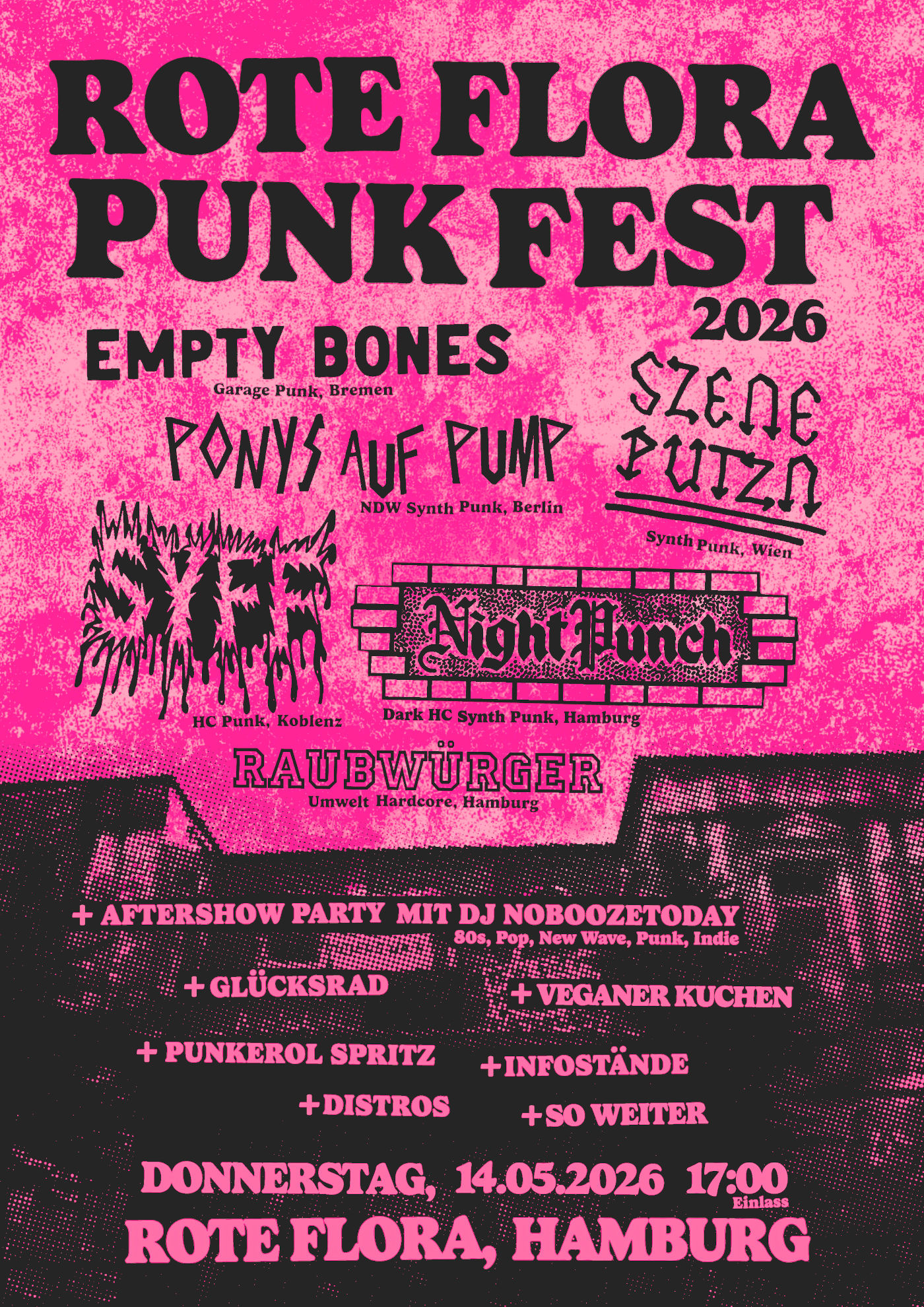 Seit Anbeginn der Zeiten sind die Rote Flora und die Punk-Subkultur miteinander verbunden. Punk findet nicht im luftleeren Raum statt. Besetzte Häuser, Autonome Zentren, Freiräume und selbstverwaltete, antiautoritäre Orte sind der Nährboden, an dem Punk in seiner edelsten Form gedeiht. Um uns selber und die Flora zu feiern, schmeißen wir am 14.05.2026 (ein Donnerstag, Himmelfahrt, malochefreier Tag für die meisten von euch hoffentlich!) ein großes Punk Fest an der besten Adresse der Stadt.